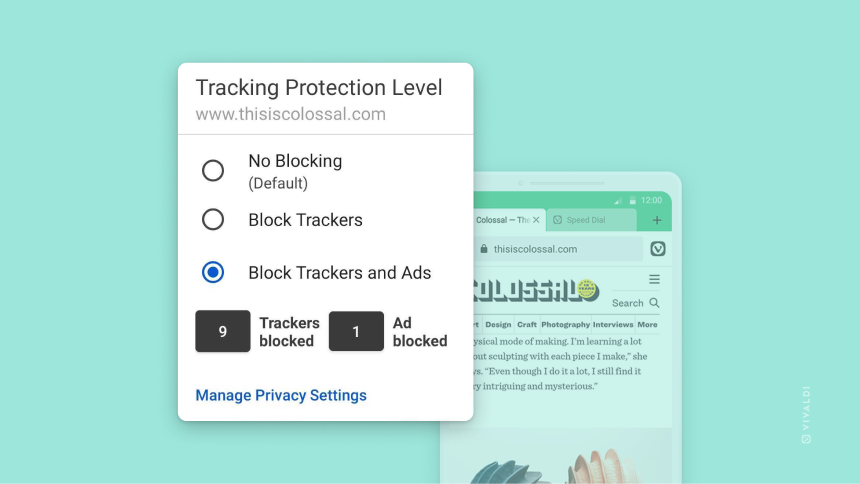 Vivaldi 6.0 для Android предлагает усовершенствованный механизм блокировки рекламы и слежки, включая: