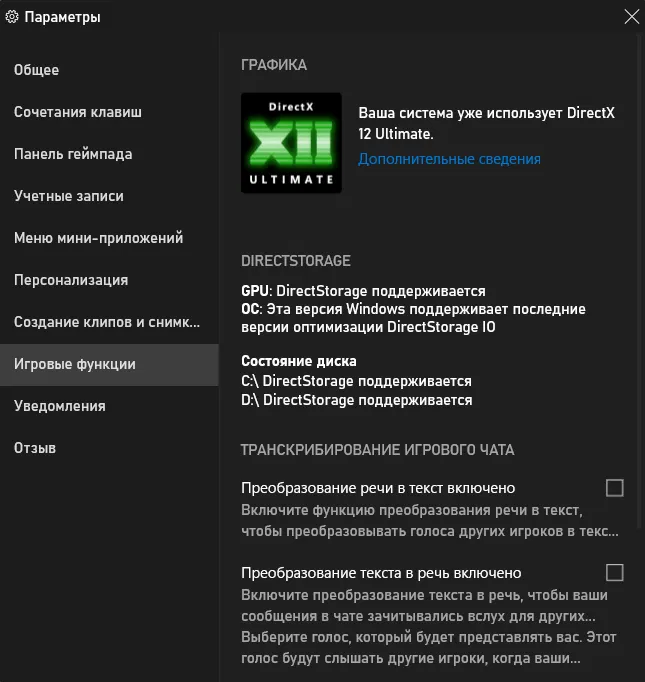 - Поддерживает ли какой-либо из подключенных дисков DirectStorage.