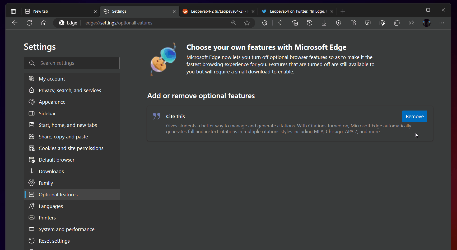 В последней версии Edge Canary появился раздел, который позволяет удалять некоторые дополнительные функции. Инсайдер Leopeva64 опубликовал анимированное GIF-изображение, на котором показана возможность удалить функцию «Цитаты». Функция, представленная в Edge 97, дает учащимся удобный способ генерировать цитаты во время исследования в Интернете.
