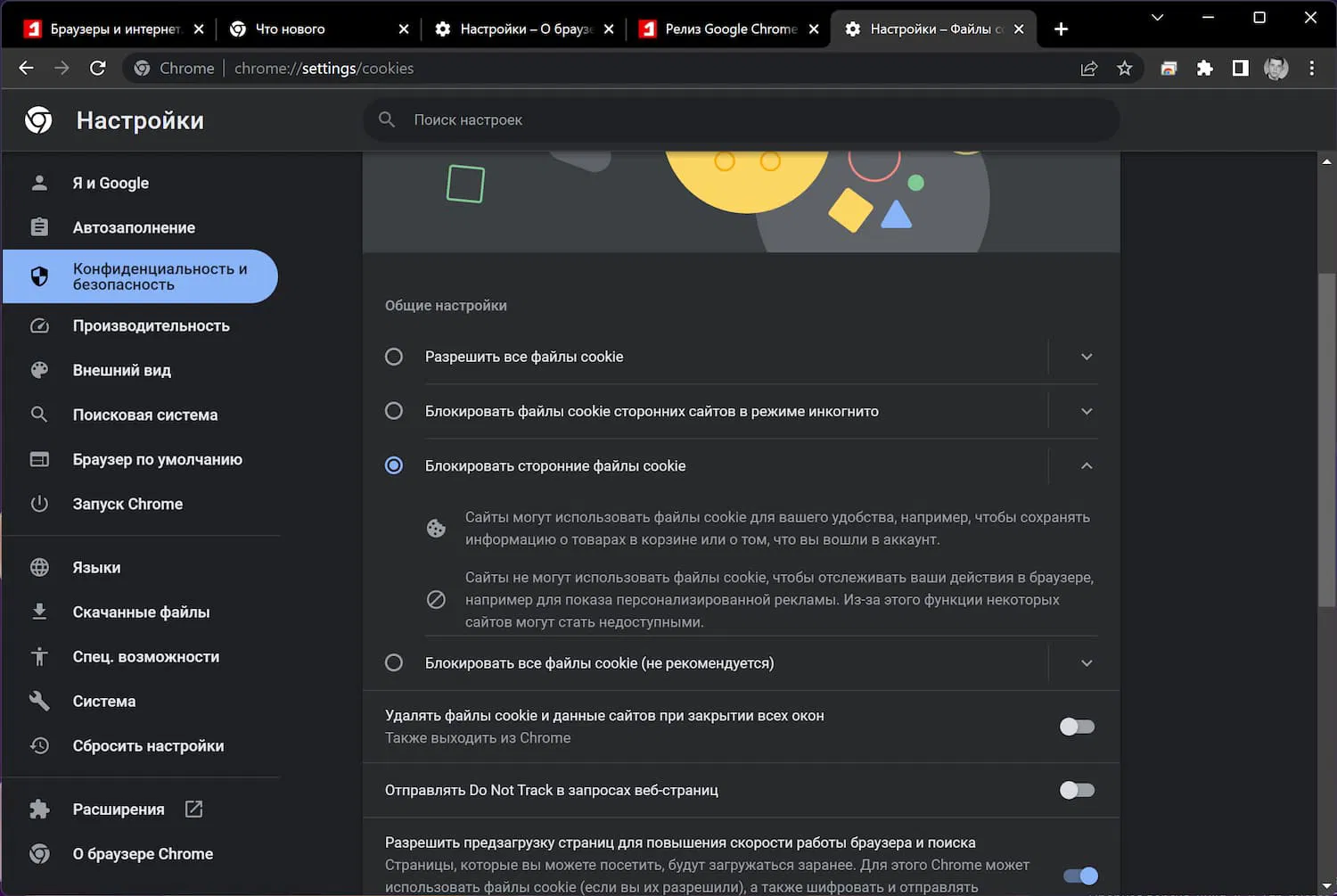 На странице chrome://settings/cookies добавлена новая опция Блокировать сторонние файлы cookie. Параметр Разрешить связанным сайтам отслеживать действия внутри группы может быть включен или выключен на странице. Эта функция отключается в режиме инкогнито автоматически.
