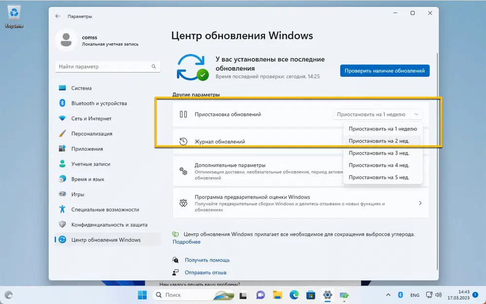 - После перезагрузки перейдите в меню Параметры > Центр обновления Windows и для параметра Приостановка обновления выберите Приостановить на 2 нед.. Обычно после этого срока становится доступно предварительное обновление с исправлениями известных ошибок.