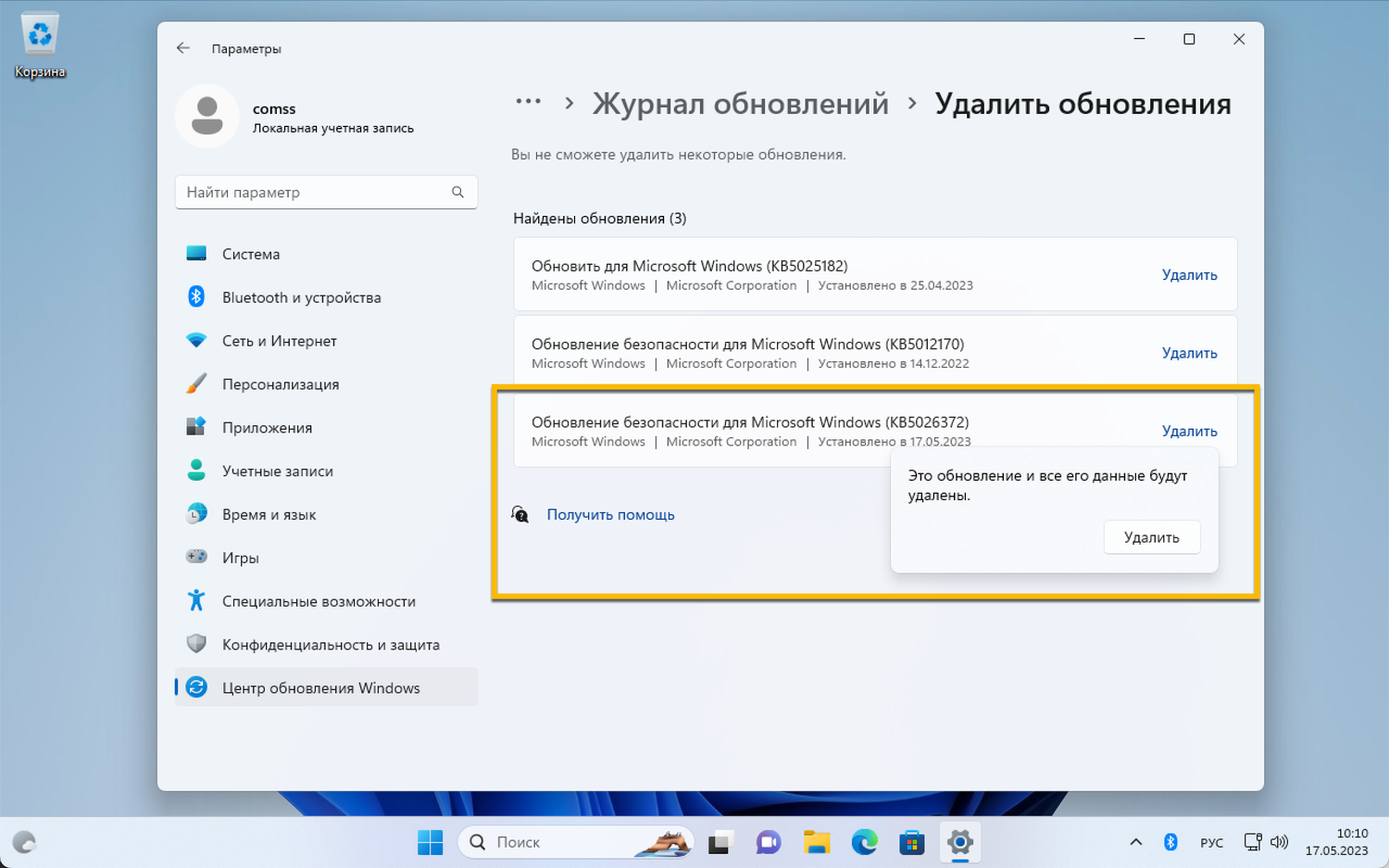 - Найдите в списке Обновление безопасности для Microsoft Windows (KB5026372) и нажмите Удалить.
