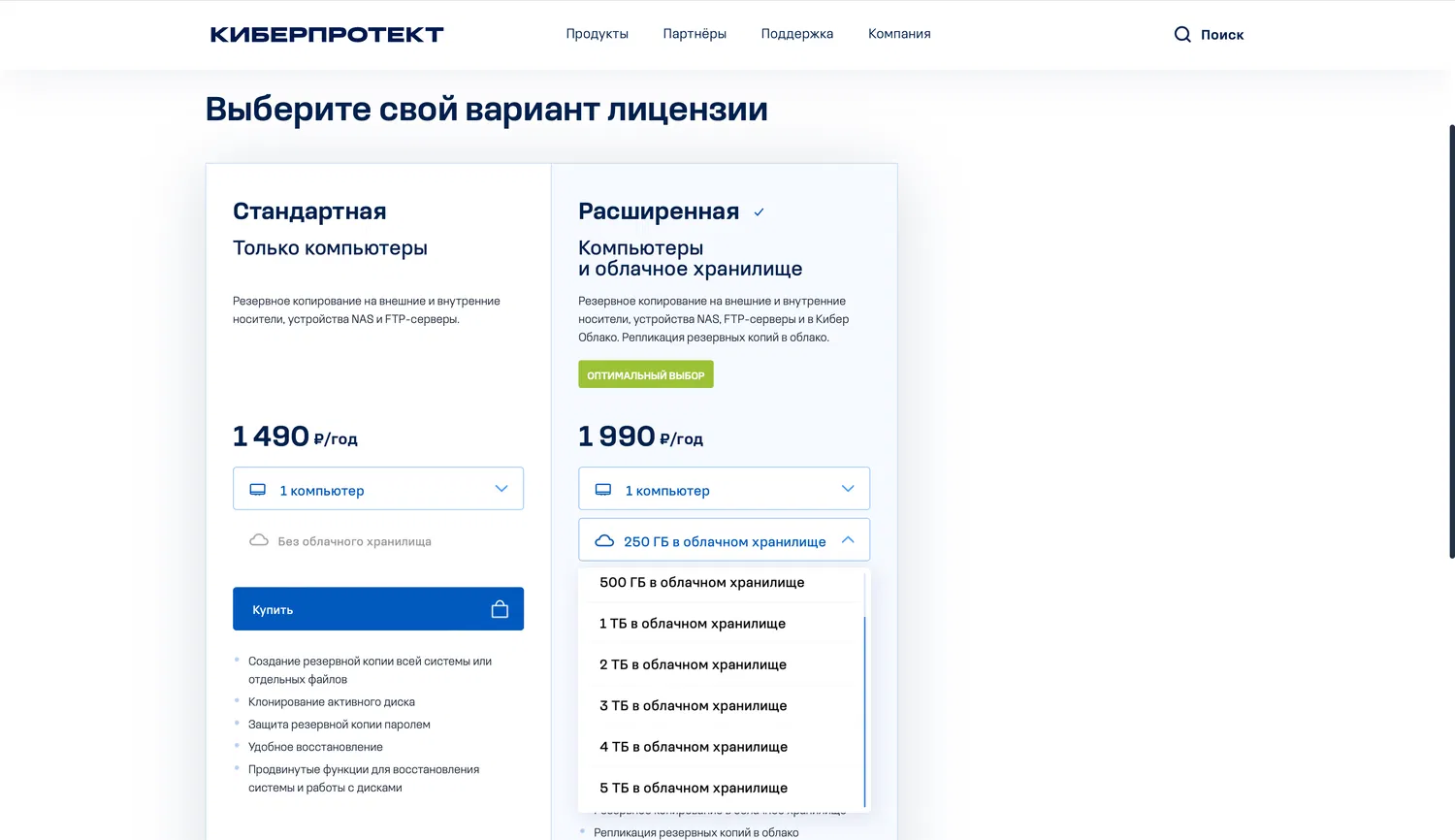 Кибер Бэкап Персональный доступен для приобретения по системе годовой подписки, которую можно продлить в соответствии с потребностями пользователя. Стоимость подписки зависит от количества защищаемых компьютеров и объема доступного пространства в Кибер Облаке. Существуют варианты на 1, 3 и 5 компьютеров с облачным хранилищем до 5 ТБ или без него.