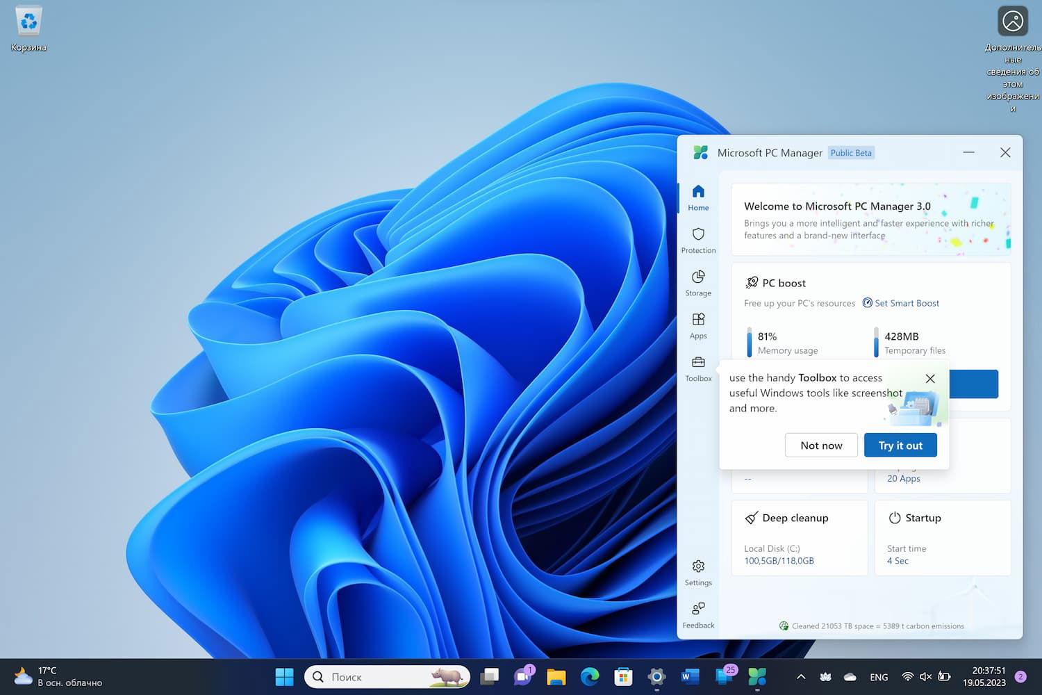 Microsoft PC Manager открывается в виде всплывающего окна прямо над областью уведомлений панели задач и разделяет свои предложения на пять разделов: Home (Главная), Protection (Защита), Storage (Хранилище), Apps (Приложения) и Toolbox (Панель инструментов). Большая часть этих функций обеспечивает удобный доступ к системным инструментам, которые уже присутствуют в Windows, начиная от Storage Sense (в разделе Хранилище) до запуска сканирования на вирусы по требованию с использованием Microsoft Defender Antivirus, который может быть активирован даже если пользователь переключился на другой инструмент безопасности.