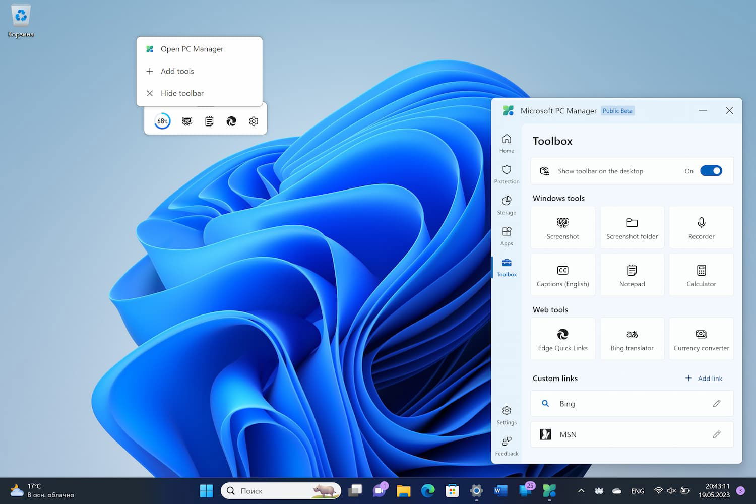 Новая панель инструментов на рабочем столе доступна через раздел Toolbox в Microsoft PC Manager, где пользователи могут включить эту функцию и выбрать, какие инструменты разместить на ней для удобного доступа.