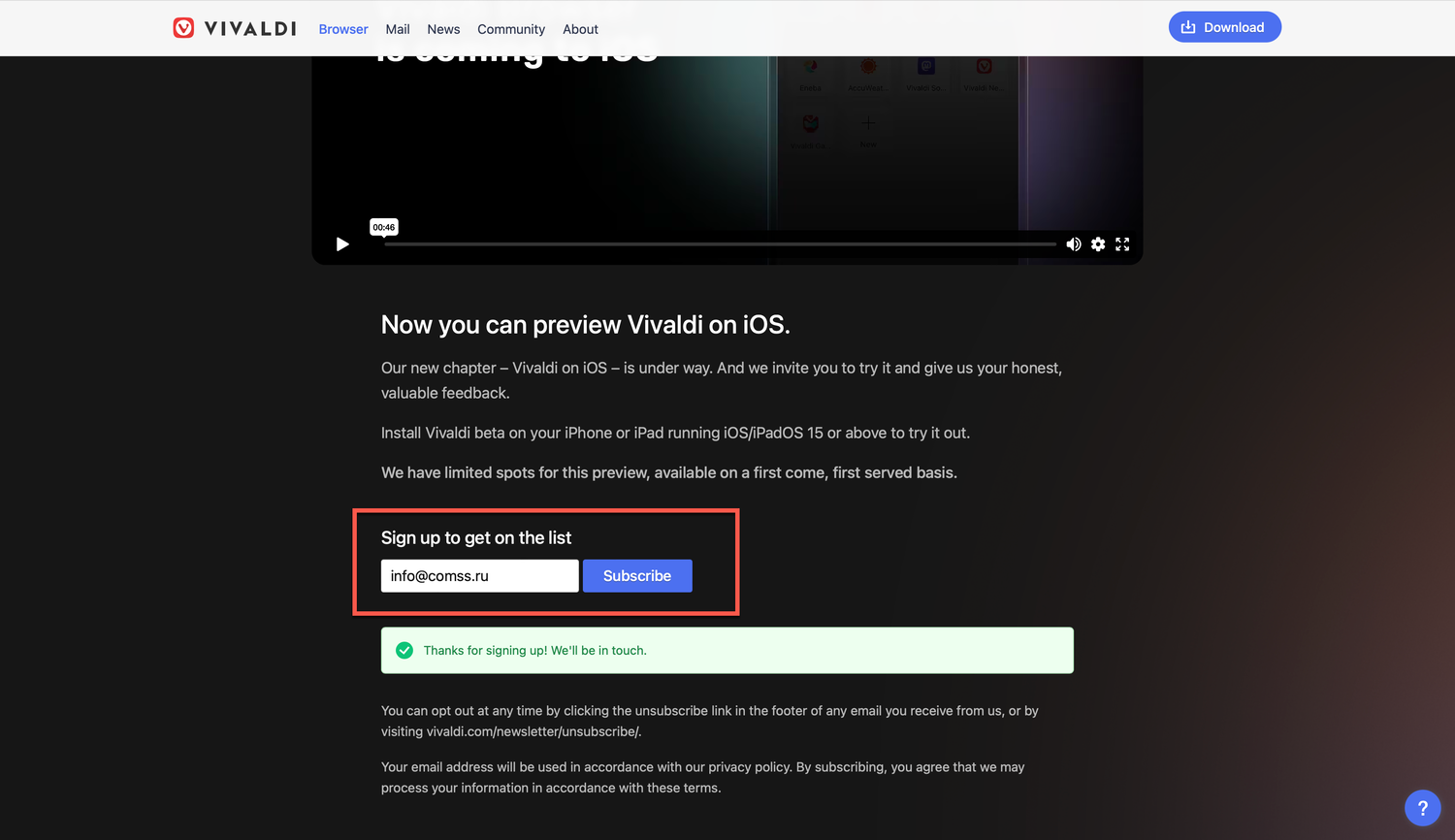 Если вы хотите попробовать бета-версию Vivaldi на iOS, просто подпишитесь на рассылку Vivaldi. После этого вы получите информацию о том, когда и где вы сможете скачать новое приложение. Обратите внимание, что количество мест для участников бета-тестирования ограничено, поэтому поторопитесь, если вы хотите одним из первых протестировать Vivaldi для iOS.