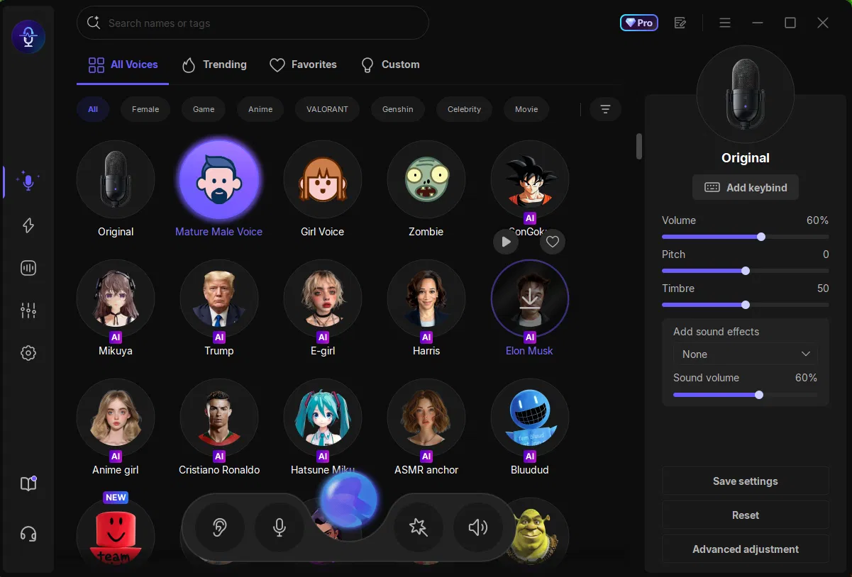 - Поддержка более 100 эффектов изменения голоса в реальном времени: Позволяет пользователям настроить свой голос, чтобы звучать по-разному, включая имитацию голосов популярных персонажей, таких как карт Вейдер, девушка и Гостфейс.