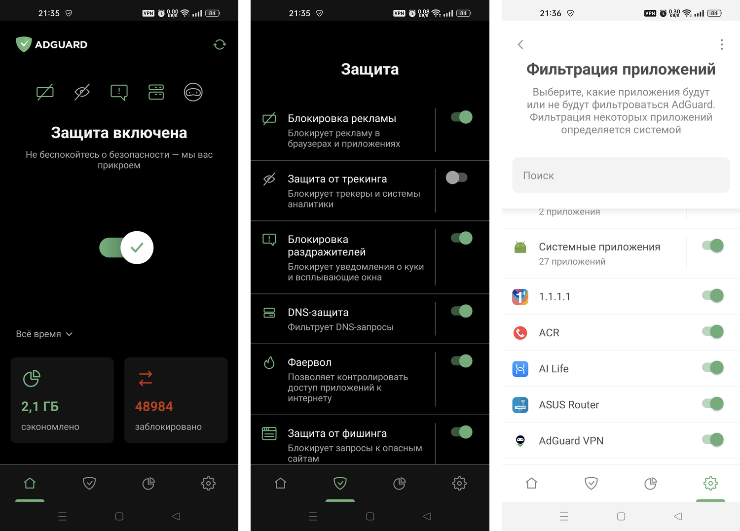 - Отдельный раздел «Защита»: Этот раздел открывает дополнительные возможности для контроля над приложением. Вы можете управлять функциями «Фаервол», «Антифишинг» и даже AdGuard VPN.