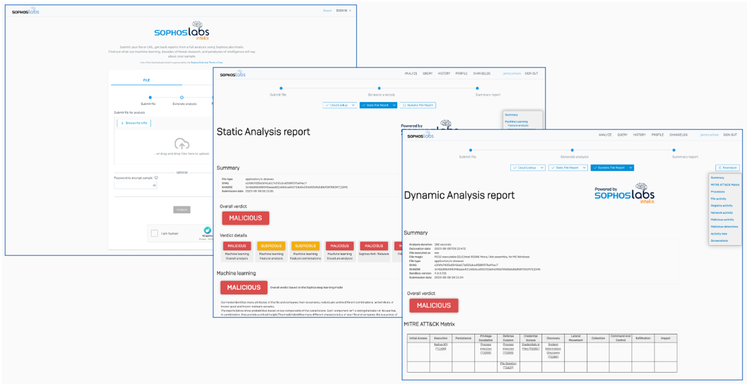 Если вы зарегистрированный клиент Sophos, портал Intelix предлагает дополнительные возможности. Войдя в систему с помощью вашего Sophos ID, вы можете получить доступ к результатам всех предыдущих анализов в течение одного года. Вы также можете мгновенно отправить анализ поддержке Sophos или SophosLabs для проведения человеческого обзора вердикта.