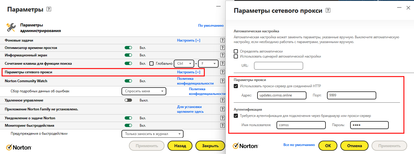 Для обновления антивируса на территории России. Для постоянного обновления Norton нужно зайти в меню "Параметры > Параметры администрирования > Параметры сетевого прокси - Настроить." Задайте следующие параметры прокси сервера::