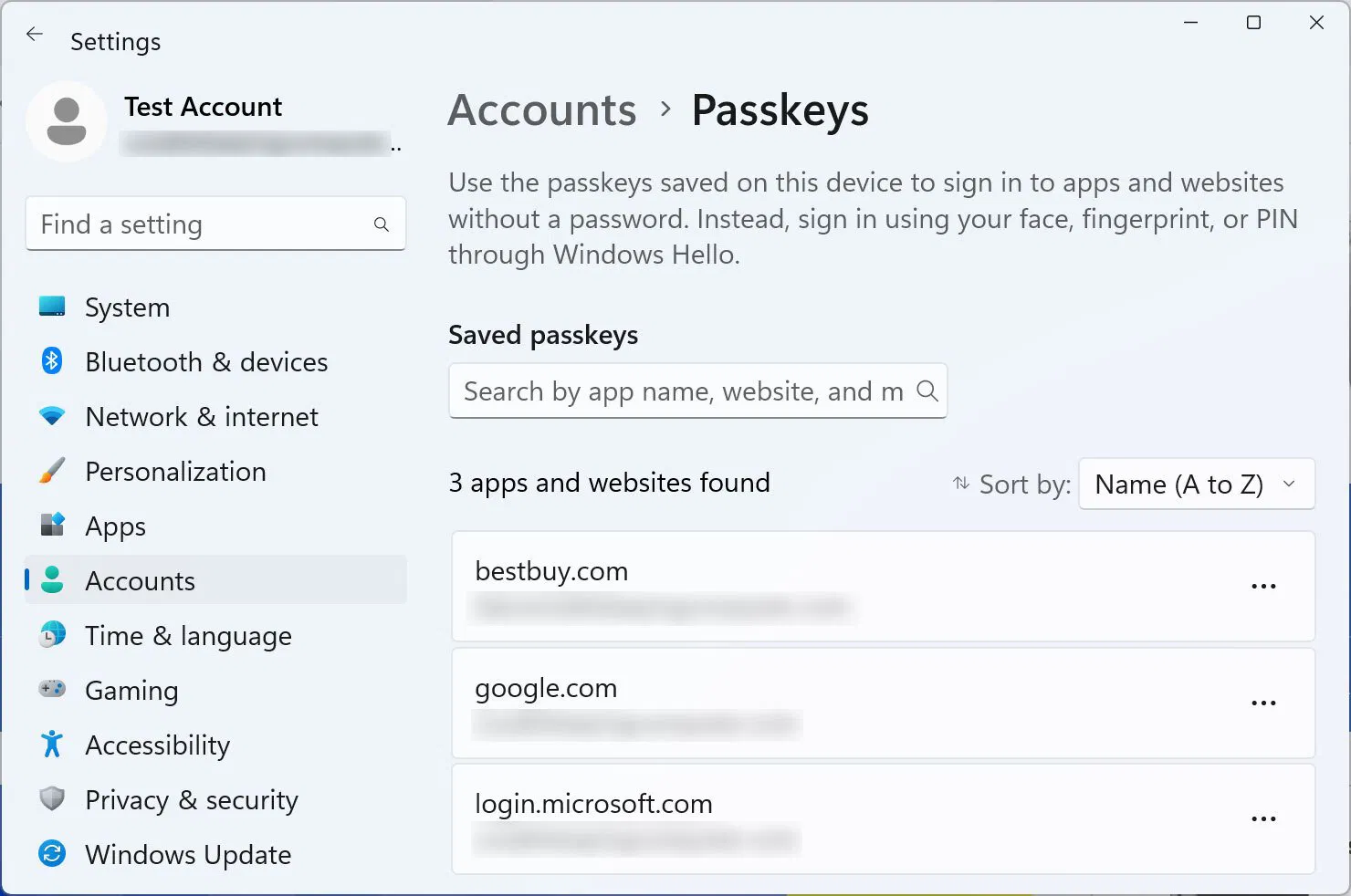 Вы также можете управлять своими ключами доступа с помощью нового диалогового окна, интегрированного в приложение «Параметры». Для этого перейдите в Параметры > Учетные записи > Ключи доступа (Passkeys).