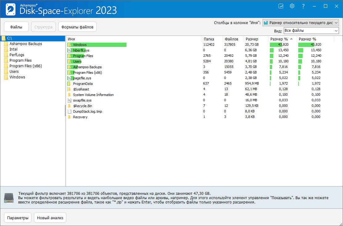 Disk Space Explorer 2023 выполняет то, что не удается сделать Windows Explorer: позволяет фильтровать диски и отображать файлы по размеру, включая их долю в общем пространстве диска. Вы также можете легко сканировать определенные типы файлов, например, показывать только фильмы или изображения. Встроенная гистограмма дает вам мгновенный обзор структуры ваших файлов и выявляет файлы и папки, которые потребляют больше всего ресурсов.