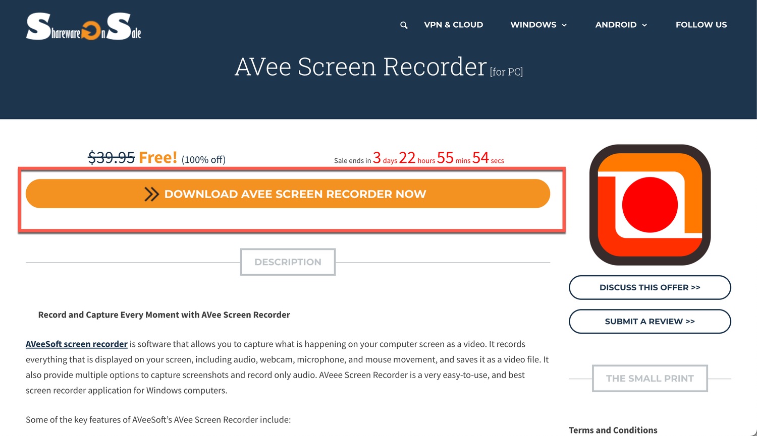 1. Перейдите на страницу промо-акции (на английском языке) и нажмите кнопку DOWNLOAD AVEE SCREEN RECORDER NOW.