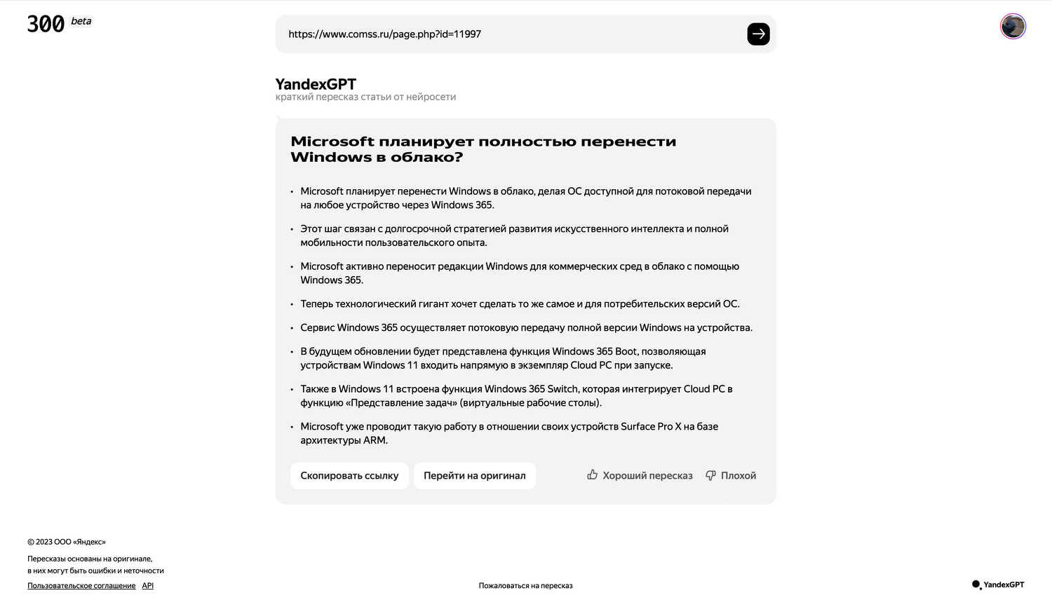 Пользователи могут опробовать новую функцию на сайте 300.ya.ru, загрузив ссылку на интересующий их материал. Затем можно скопировать ссылку на сокращенный пересказ и поделиться ею с другими, а также оценить качество пересказа или отправить жалобу.