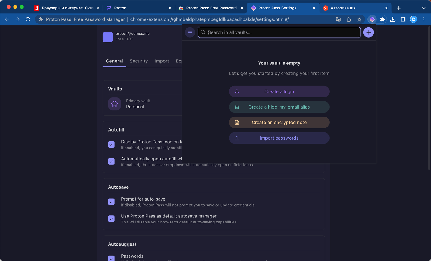 Proton Pass поддерживает основные функции менеджера паролей. Пока недоступны настольные приложения и некоторые продвинутые функции, которые есть в платной версии Bitwarden.