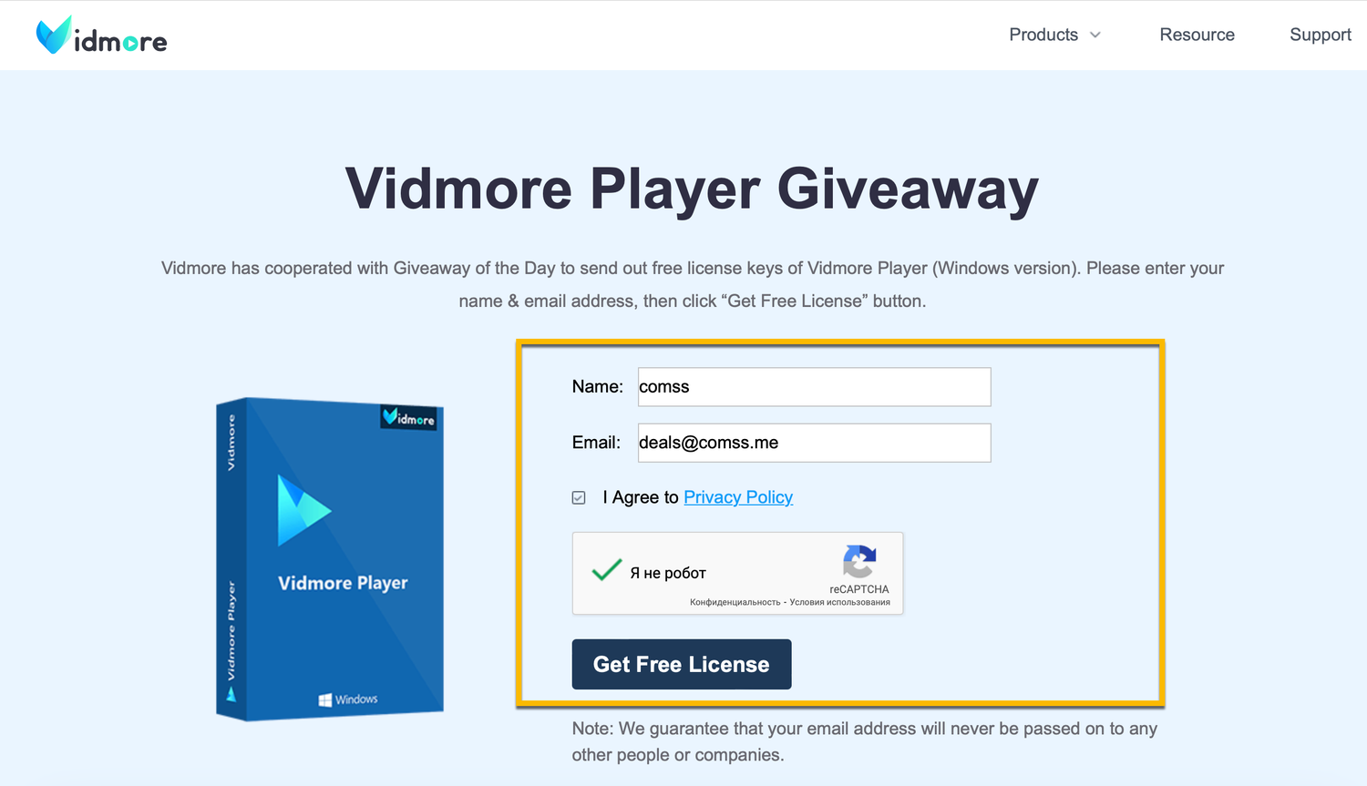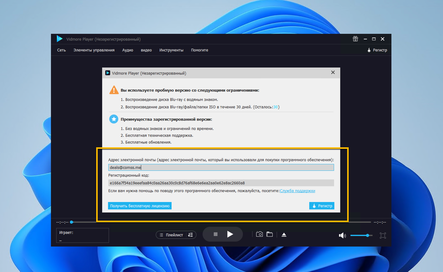 Для того, чтобы бесплатно получить лицензию Vidmore Player на 1 год выполните следующие действия: