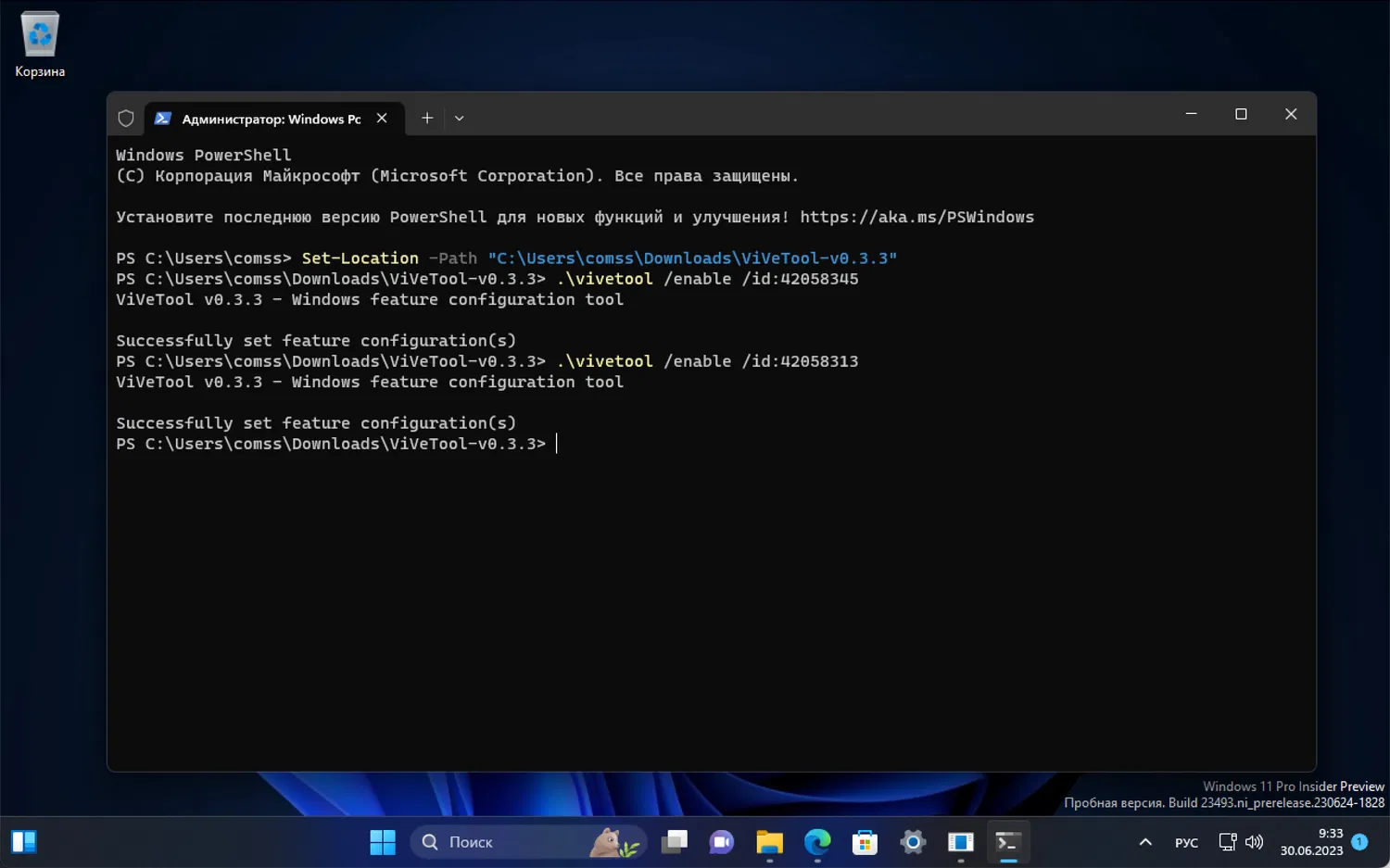 В примерах используются команды в Терминале для профиля PowerShell . Если вы используете профиль Командная строка, замените начальную команду .\vivetool на vivetool.