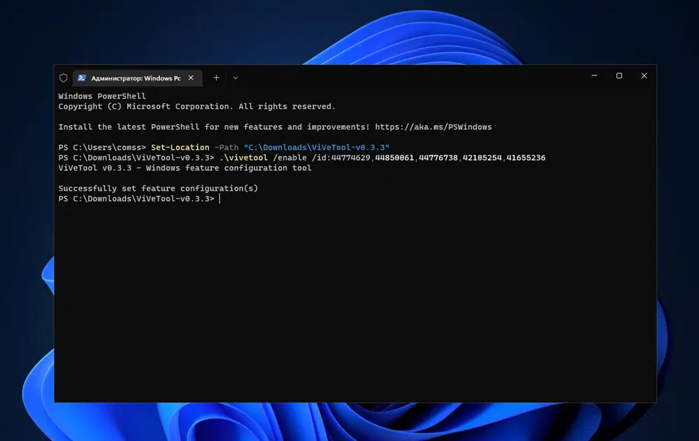 В примерах используются команды в Терминале для профиля PowerShell . Если вы используете профиль Командная строка, замените начальную команду .\vivetool на vivetool.