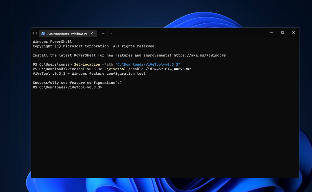 В примерах используются команды в Терминале для профиля PowerShell . Если вы используете профиль Командная строка, замените начальную команду .\vivetool на vivetool.