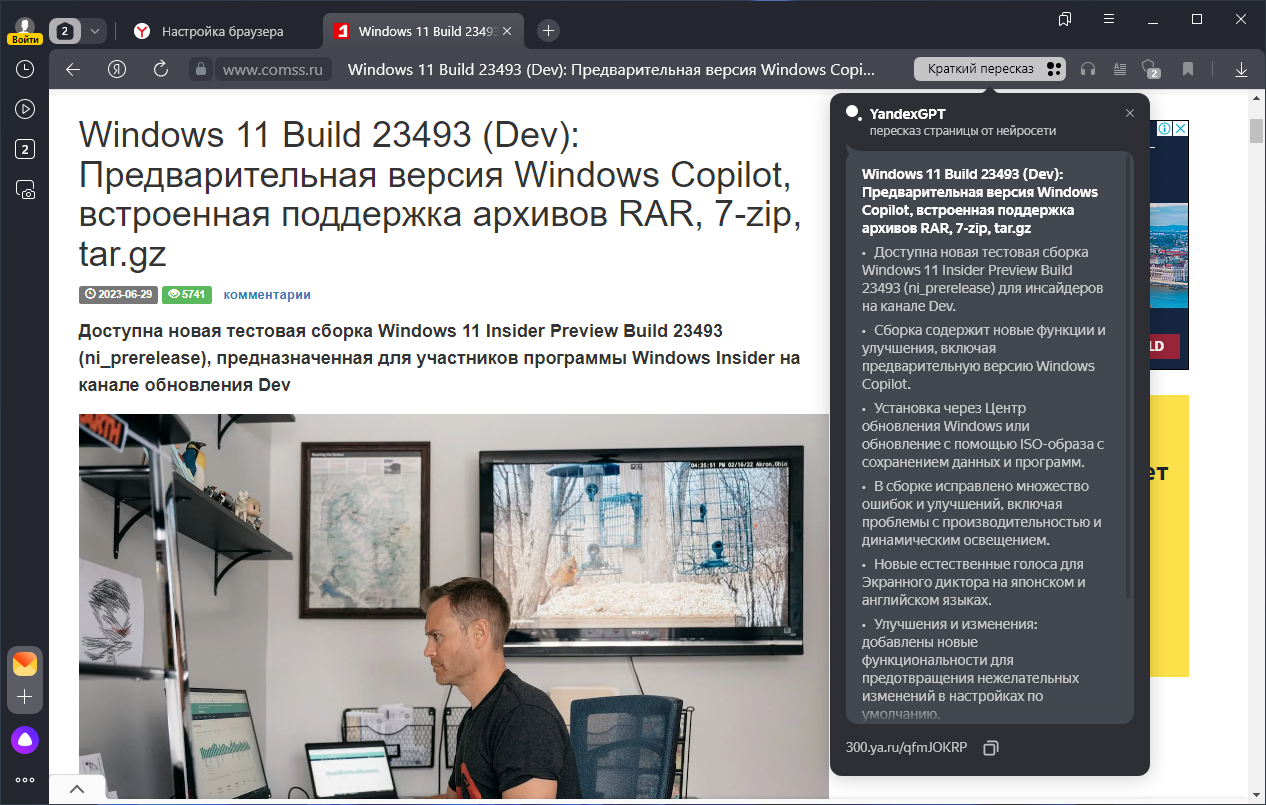 Нейросеть YandexGPT встроенная в браузер, обобщает суть материала в нескольких коротких тезисах, которые отображаются прямо в интерфейсе поверх открытой страницы.