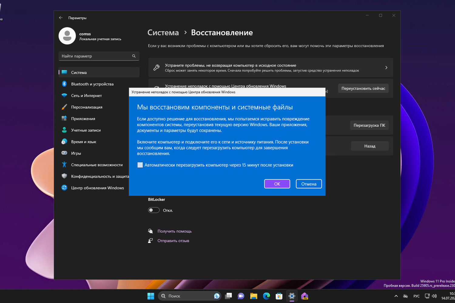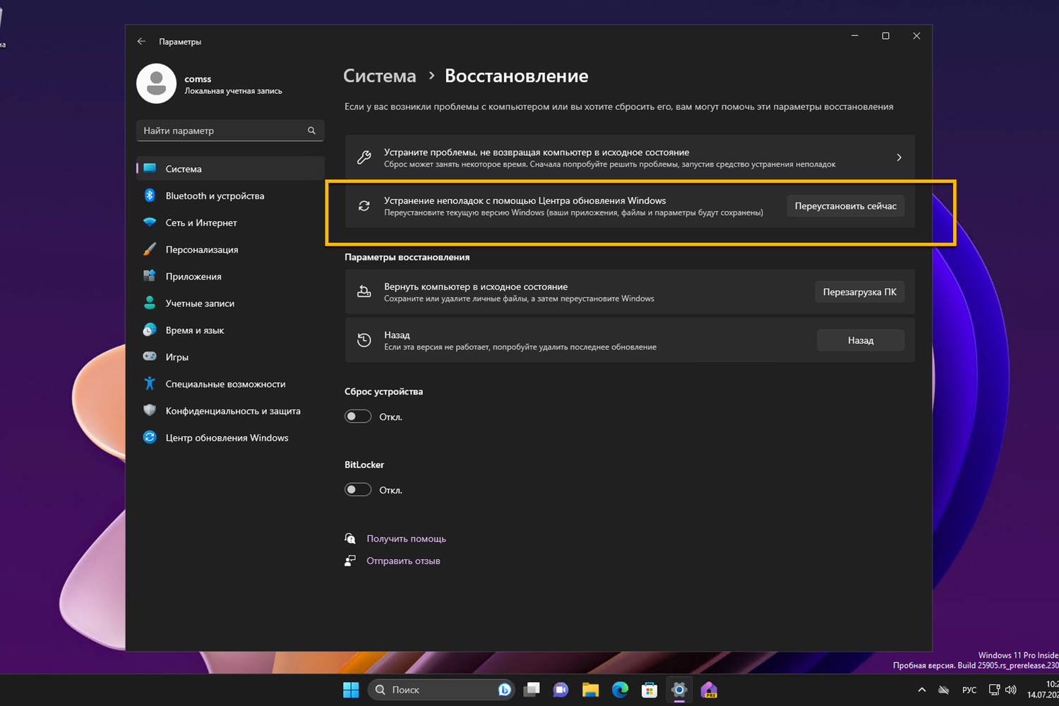 Для проверки новой системы восстановления откройте приложение Параметры и перейдите в меню Система > Восстановление > Устранение неполадок с помощью Центра обновления Windows (или Центр обновления Windows > Дополнительные параметры > Восстановление > Устранение неполадок с помощью Центра обновления Windows) и нажмите кнопку Переустановить сейчас.