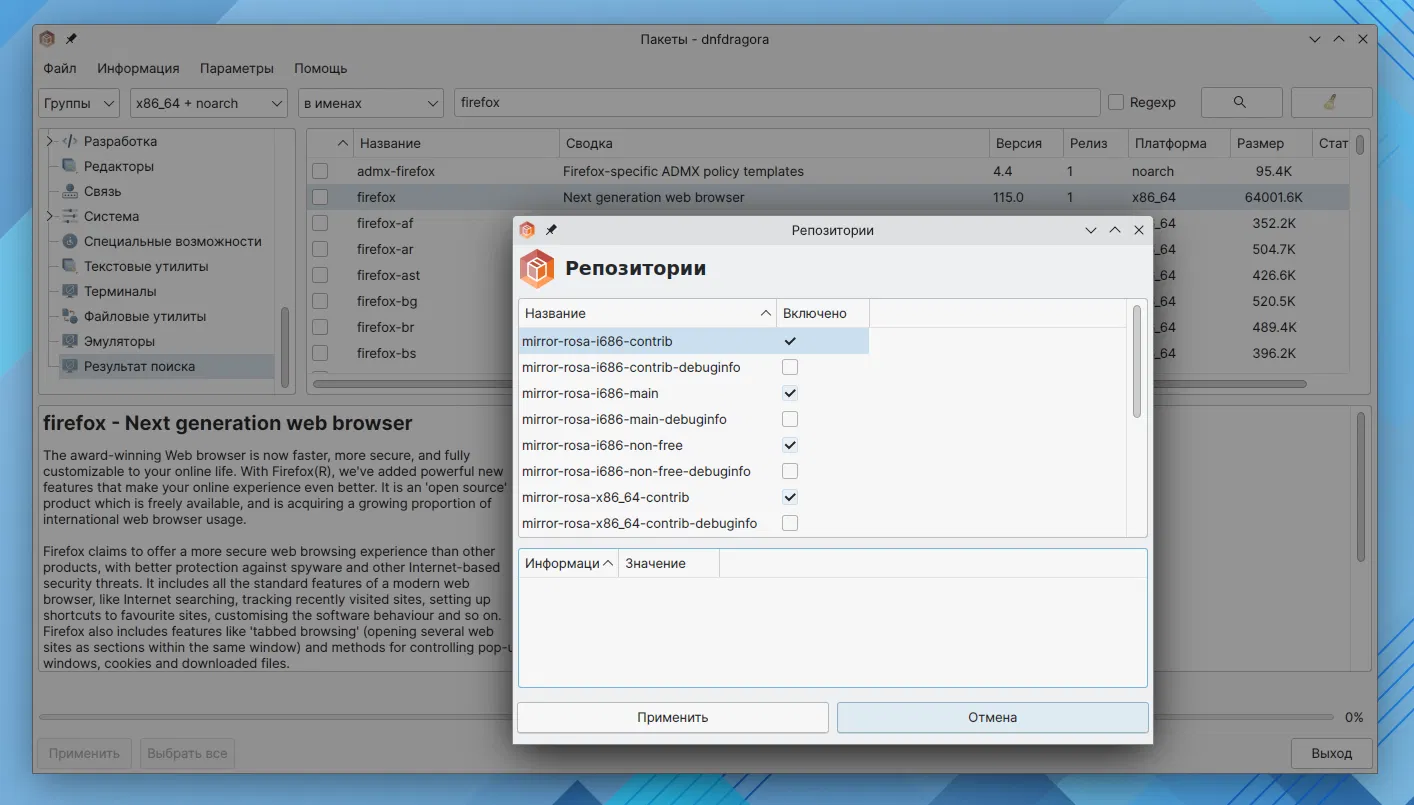 Для установки приложений можно воспользоваться графической утилитой Dnfdragora (многим известной при использовании дистрибутива Fedora), в меню приложений утилита называется Пакеты (установка и удаление программ). Выбираем нужное приложение, ставим галочку напротив приложения и нажимаем на кнопку Применить, в левом нижнем углу.
