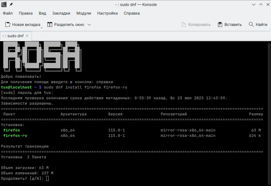 ROSA «Fresh» использует менеджер пакетов DNF и формат пакетов RPM. Это означает, что вы можете устанавливать приложения с расширением rpm. Для установки подойдут установочные файлы rpm с оф.сайтов и не подойдут (в большинстве случаев) rpm файлы с репозиториев Fedora.