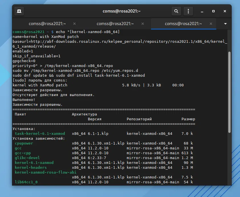 echo "[kernel-xanmod-x86_64] name=kernel with XanMod patch baseurl=http://abf-downloads.rosalinux.ru/kelpee_personal/repository/rosa2021.1/x86_64/kernel_6_1_xanmod/release/ enabled=1 skip_if_unavailable=1 gpgcheck=0 priority=0" > /tmp/kernel-xanmod-x86_64.repo sudo mv /tmp/kernel-xanmod-x86_64.repo /etc/yum.repos.d sudo dnf update && sudo dnf install task-kernel-6.1-xanmod