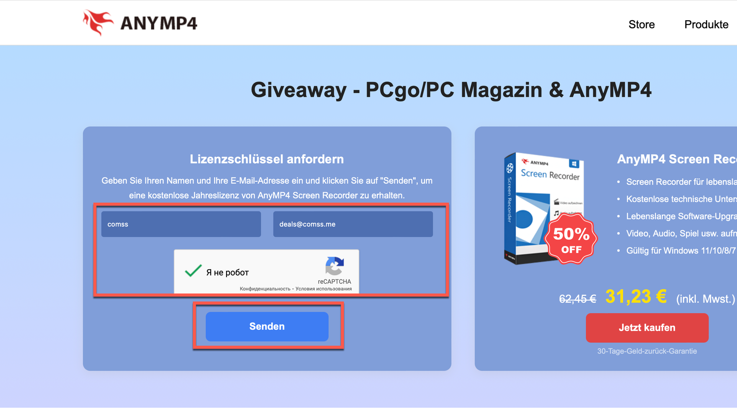2. Укажите ваше имя, адрес электронной почты, пройдите капчу "Я не робот" и нажмите кнопку Senden.