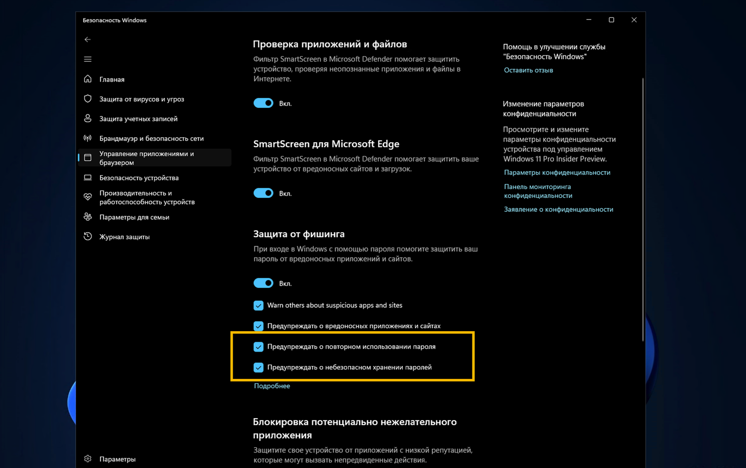 По умолчанию Windows 11 защищает от использования пароля во вредоносных приложениях или на вредоносных сайтах. Пользователи и администраторы могут отключить эту функцию или расширить ее, включив предупреждения о повторном использовании пароля и небезопасном хранении паролей.