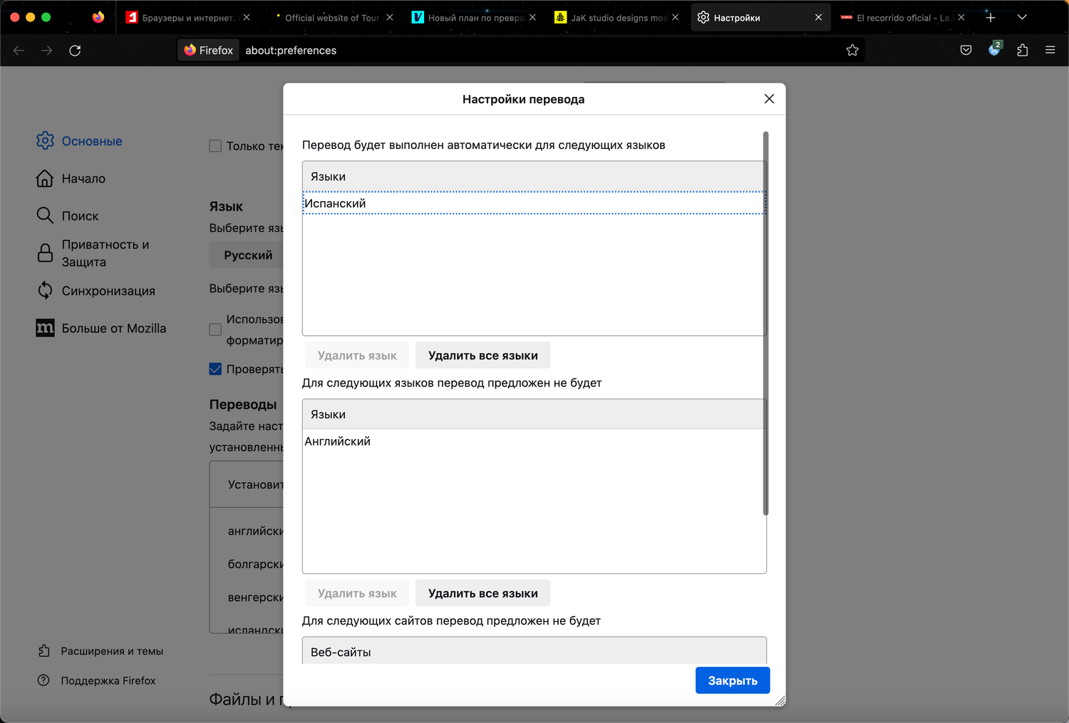 При выборе опции Никогда не переводить с [язык], язык будет добавлен во 2-й раздел в настройках. Инструмент перевода Firefox также имеет функцию белого списка, которая запрещает перевод определенных сайтов. Как и в случае с двумя другими вариантами, доступ к ней можно получить, только находясь на сайте. Процесс кажется несколько запутанным.