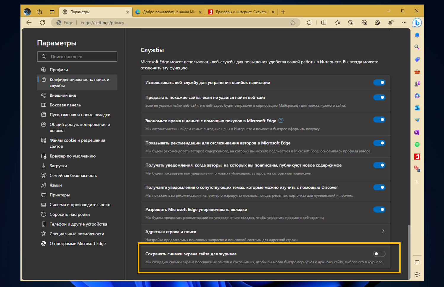 Пользователи Microsoft Edge могут перейти на внутреннюю страницу edge://settings/privacy или выбрать Меню > Настройки > Конфиденциальность, поиск и службы, чтобы проверить наличие новой опции Сохранять снимки экрана сайта для журнала в нижней части страницы настроек в разделе Службы.
