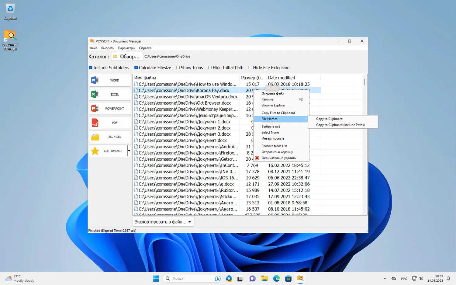 - Поддержка различных форматов файлов Вы можете легко просматривать файлы Word, Excel, PowerPoint и PDF. Кроме того, вы можете создать собственную категорию, где можете определить форматы, которые вас больше всего интересуют. Не только вы можете получить список всех файлов, соответствующих определенному критерию сортировки, но и щелкнуть правой кнопкой мыши по файлу и получить доступ к дополнительным действиям. Вы можете открыть документ в связанной с ним программе, переименовать его, удалить из списка или полностью удалить с вашего компьютера Windows без необходимости доступа к его папке. Вы можете скопировать файлы или имена файлов в буфер обмена, чтобы вставить их позже. Списки файлов можно экспортировать в TXT или CSV, чтобы позже тщательно их изучить.