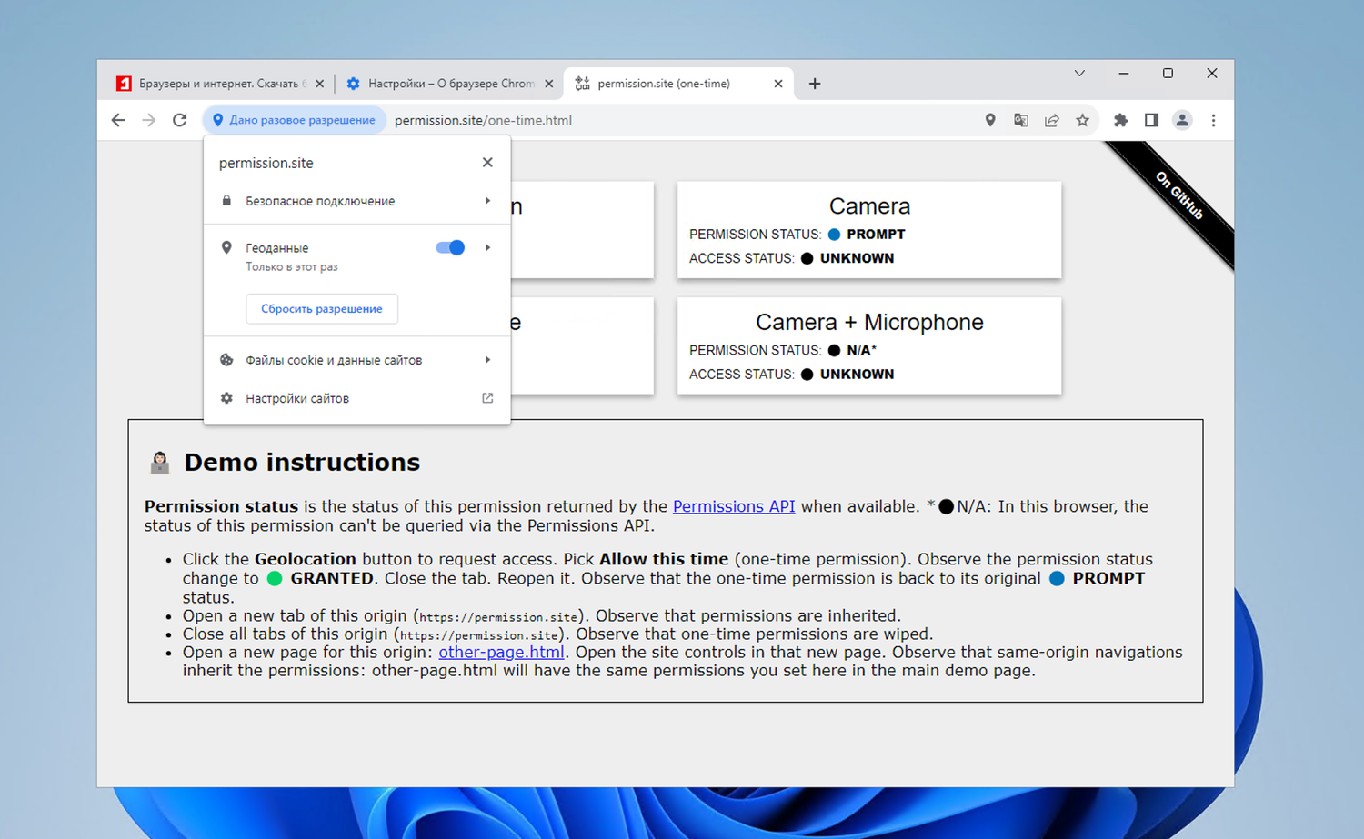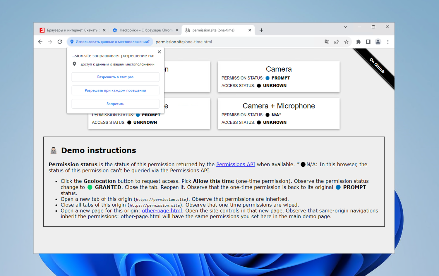 Самое важное изменение Chrome 116 — одноразовые разрешения для сайтов, которые тестировались еще с апреля этого года. Теперь при посещении веб-ресурса, который запрашивает доступ к геолокации, микрофону или другим данным, пользователь может временно предоставить разрешение, выбрав опцию Разрешить в этот раз. Раньше можно было только заблокировать запрос или выдать разрешение на постоянной основе. Старые варианты были переименованы в Разрешать при каждом посещении и Запретить для большей наглядности.