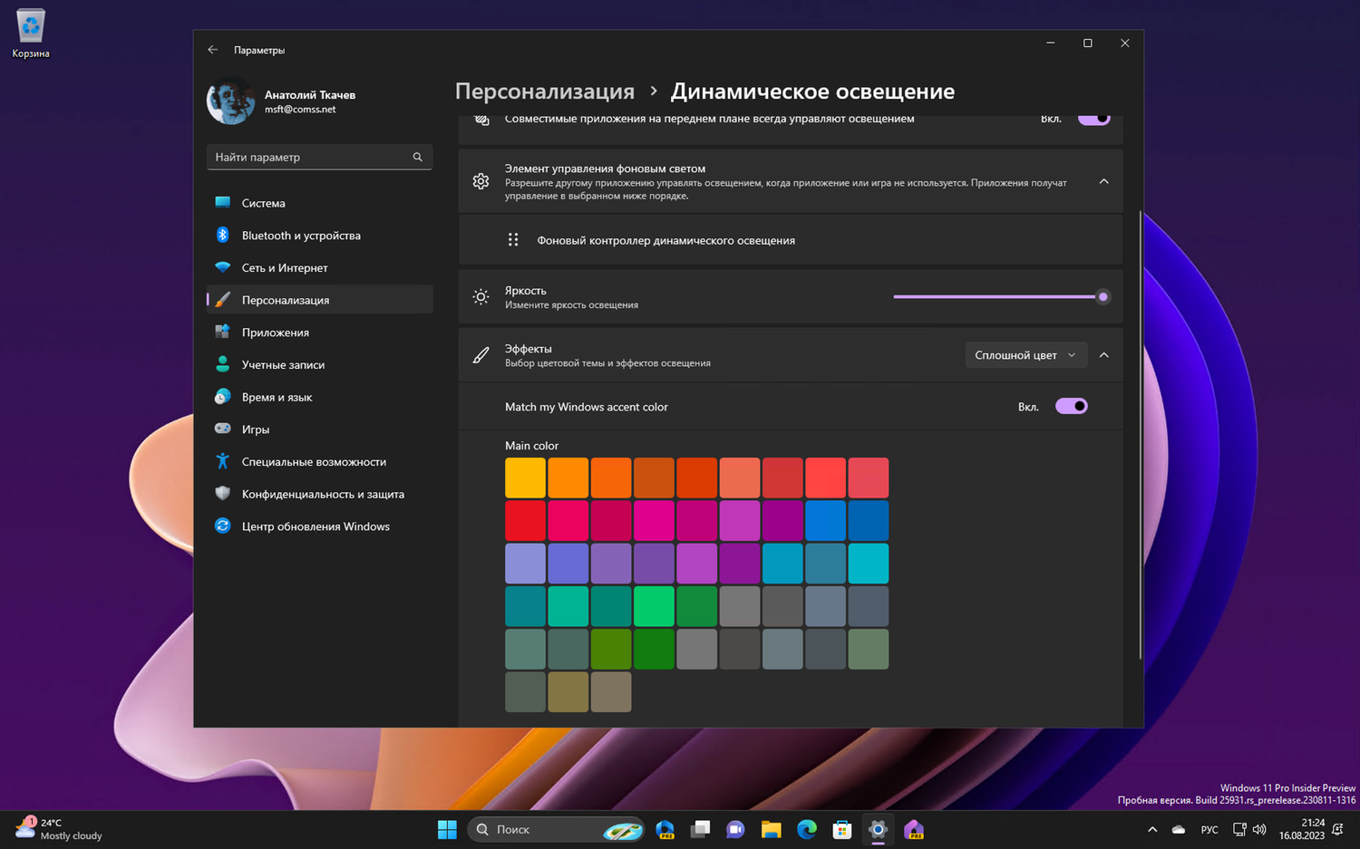 - Теперь можно мгновенно синхронизировать цвет акцента Windows с окружающими вас устройствами с помощью переключателя "Согласовать мой цвет акцента Windows" в разделе "Эффекты" для динамического освещения через Параметры > Персонализация > Динамическое освещение.