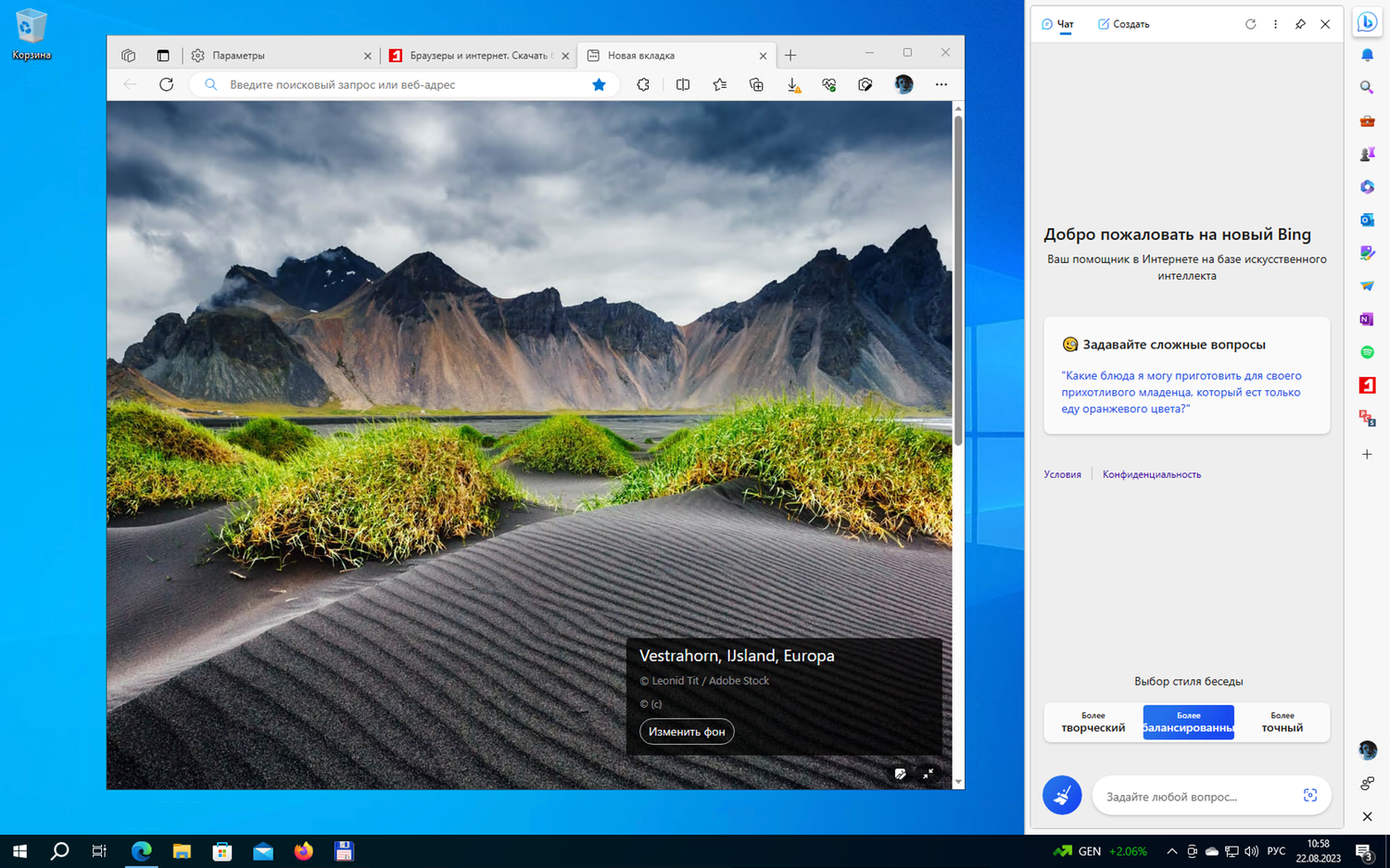 Опционально пользователи Windows 10 могут прикрепить боковую панель к рабочему столу Windows, нажав на всплывающий значок рядом с боковой панелью браузера. Это позволяет работать в совмещенном режиме с любыми приложениями Windows, включая сам Microsoft Edge. Пользователи получают упрощенный доступ к тому же набору мощных ИИ-инструментов и веб-служб, включая Bing Chat, не запуская окно браузера, что повышает продуктивность работы.