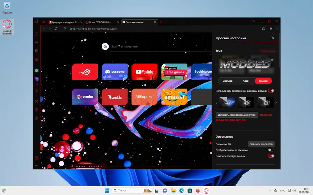 Браузер Opera GX ASUS ROG edition обладает рядом полезных функций для геймеров: возможностью установки ограничений на использование ресурсов CPU, RAM и сети, обширными настройками через GX Mods и интеграцией с популярными платформами, такими как Discord и Twitch. Кроме того, благодаря боковой панели пользователи могут быстро делиться контентом в таких приложениях, как TikTok, WhatsApp* и Instagram* (* Принадлежат компании Meta, организация признана экстремистской, ее деятельность запрещена на территории России).