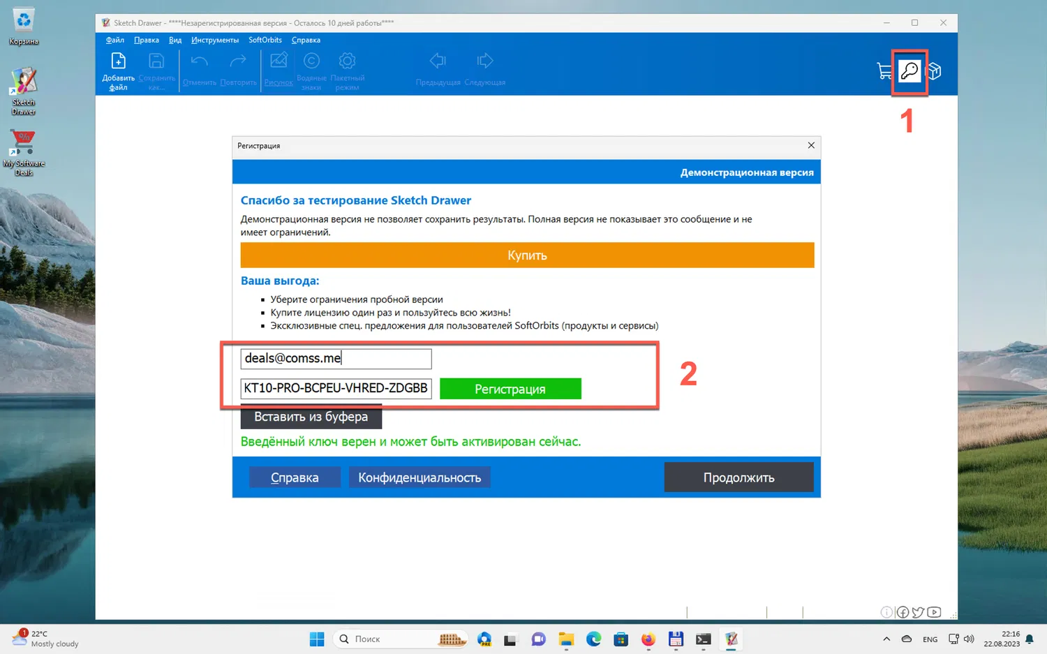 2. Активируйте полную версию программы в меню Регистрация (иконка "ключа"), указав адрес электронной почты и используя следующий код лицензии: