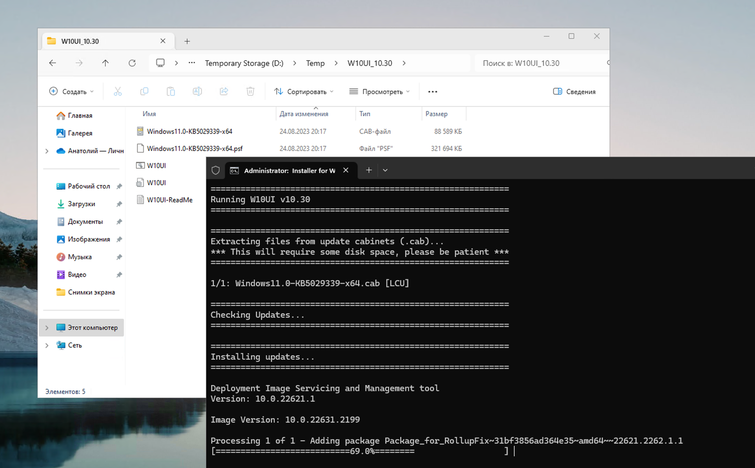 - Скачайте два файла обновления KB5029339 (.CAB и .PSF) для выбранной платформы (x64 или ARM64) и поместите в папку W10UI_10.30.