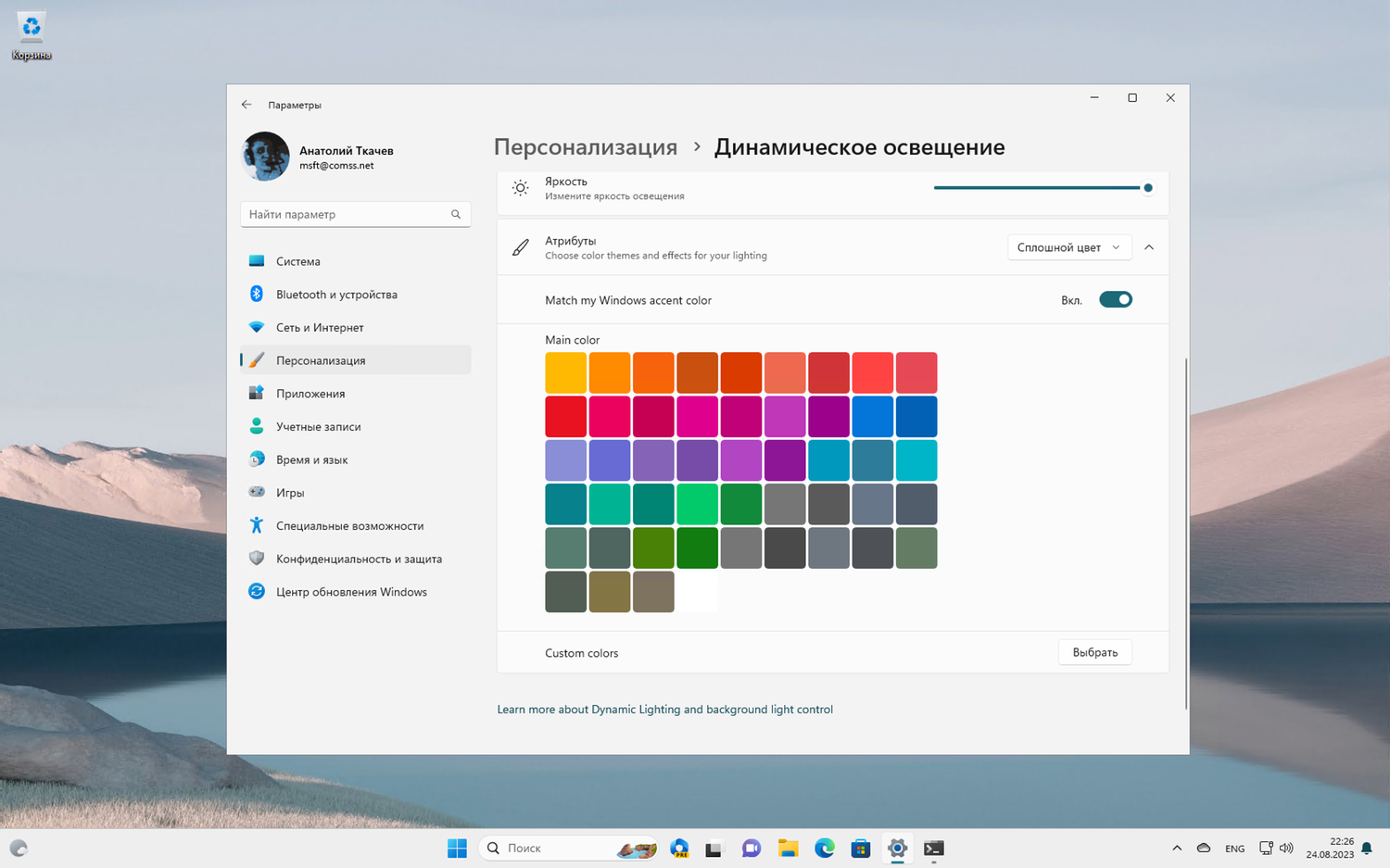 - Появилась возможность мгновенно синхронизировать цвет акцентов Windows с цветами окружающих устройств, используя переключатель "Match my Windows accent color" (Совпадать с моим цветом акцента Windows).