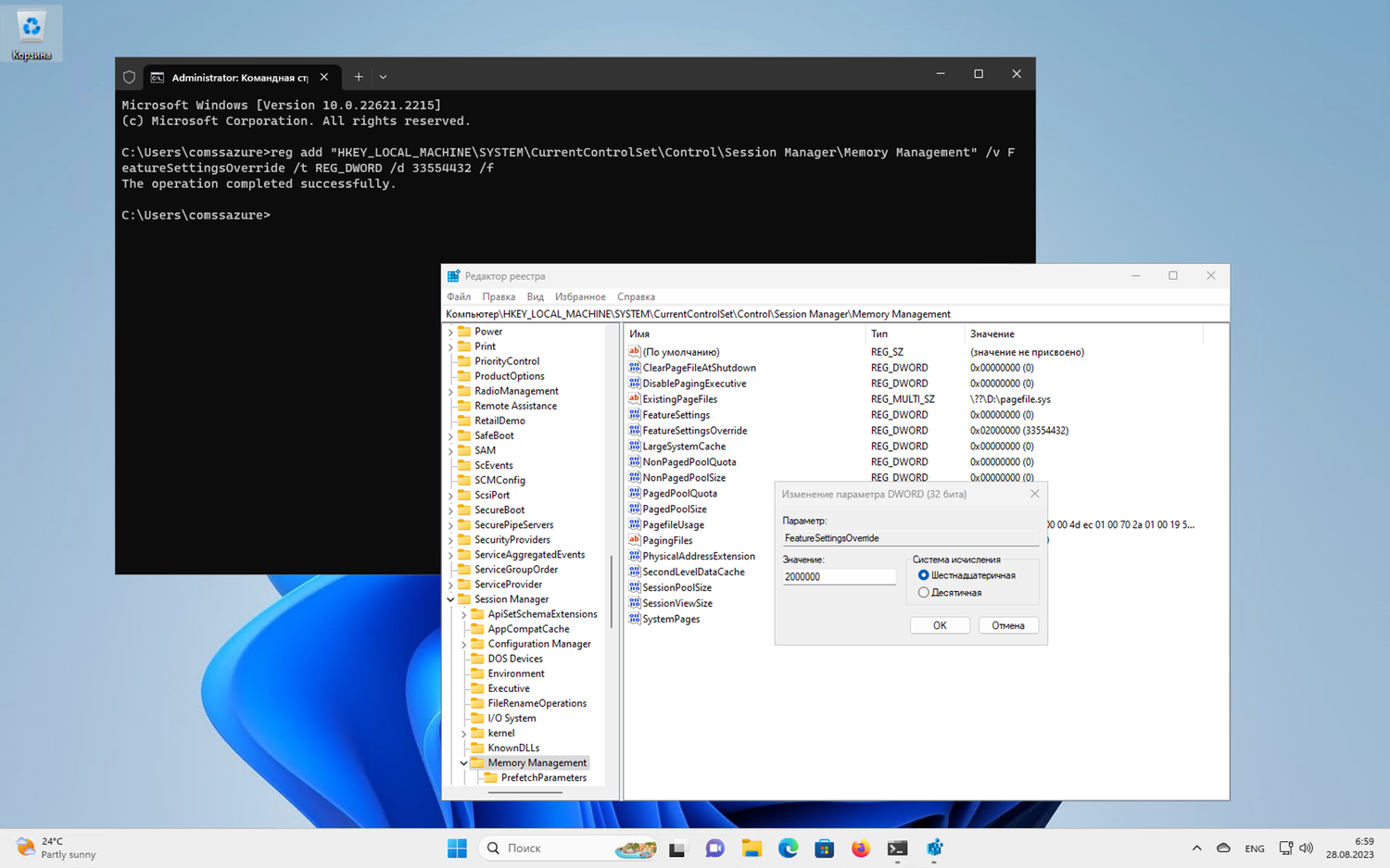 reg add "HKEY_LOCAL_MACHINE\SYSTEM\CurrentControlSet\Control\Session Manager\Memory Management" /v FeatureSettingsOverride /t REG_DWORD /d 33554432 /f