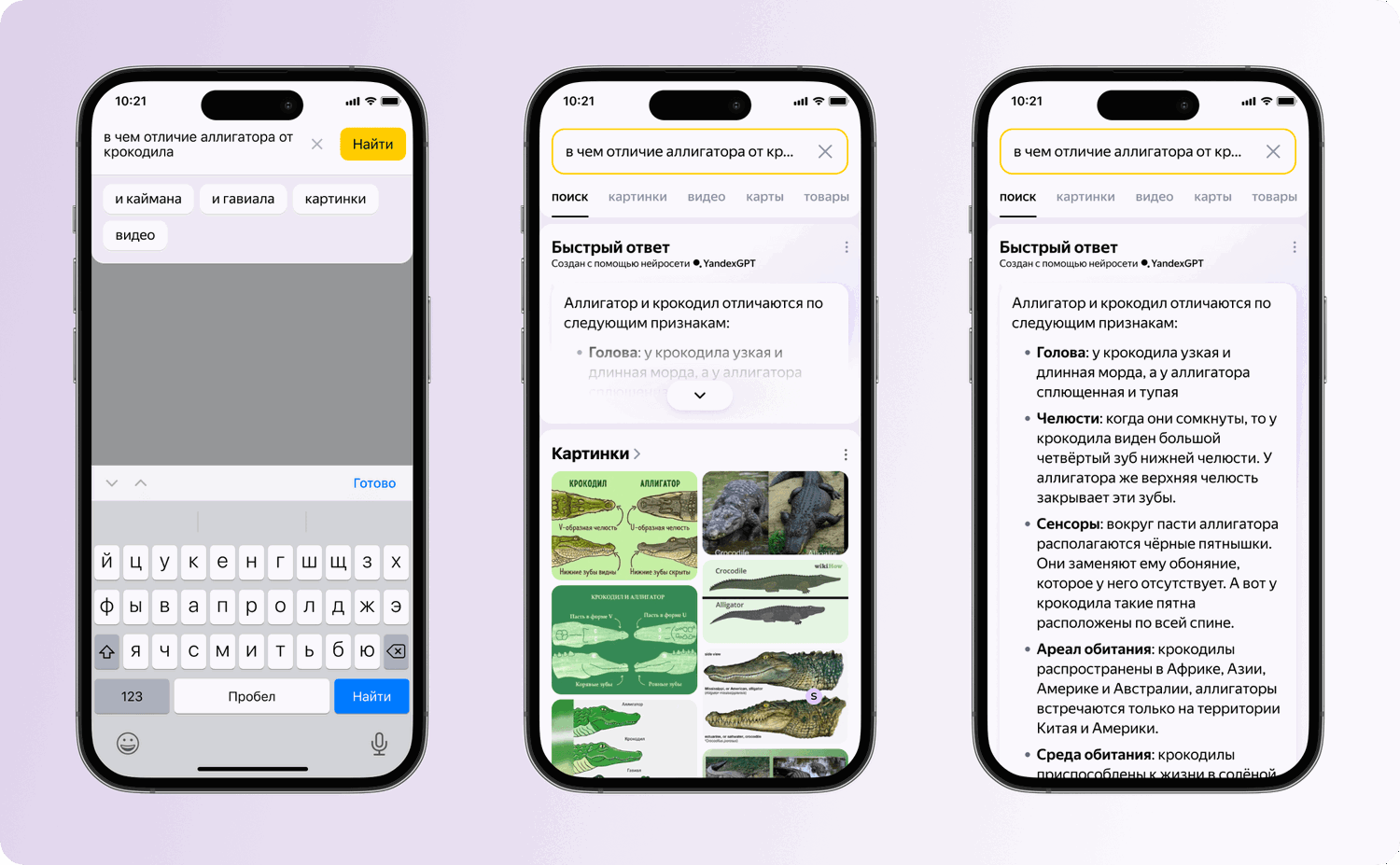 - Примеры ответов: Среди возможных запросов — различия между аллигатором и крокодилом или плюсы и минусы покупки апартаментов вместо квратиры.