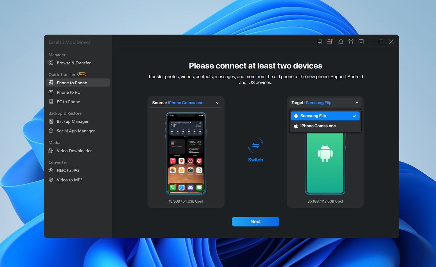 - Мастер управления мобильными данными: Поддерживает iOS 17 и позволяет передавать данные между устройствами Android, а также между устройствами Android и iOS.
