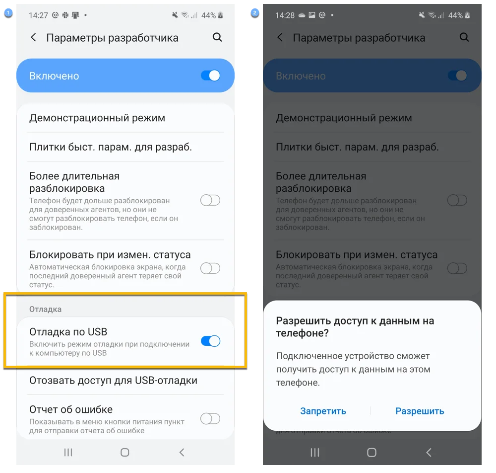 - На вашем мобильном устройстве включите Отладка по USB в меню Android Настройки > Параметры разработчика > Отладка.