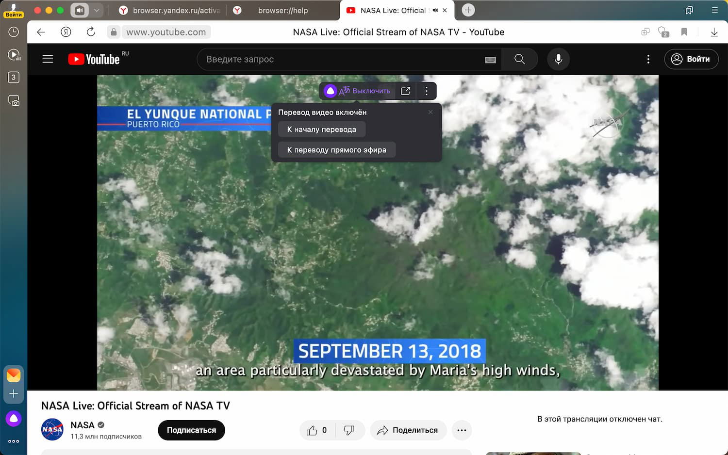 Нейросетевой перевод поддерживает пять основных европейских языков: английский, немецкий, французский, итальянский и испанский. Чтобы активировать эту функцию, достаточно нажать на кнопку «Перевести трансляцию», когда вы просматриваете стрим на YouTube через Яндекс.Браузер, например, на канале NASA.