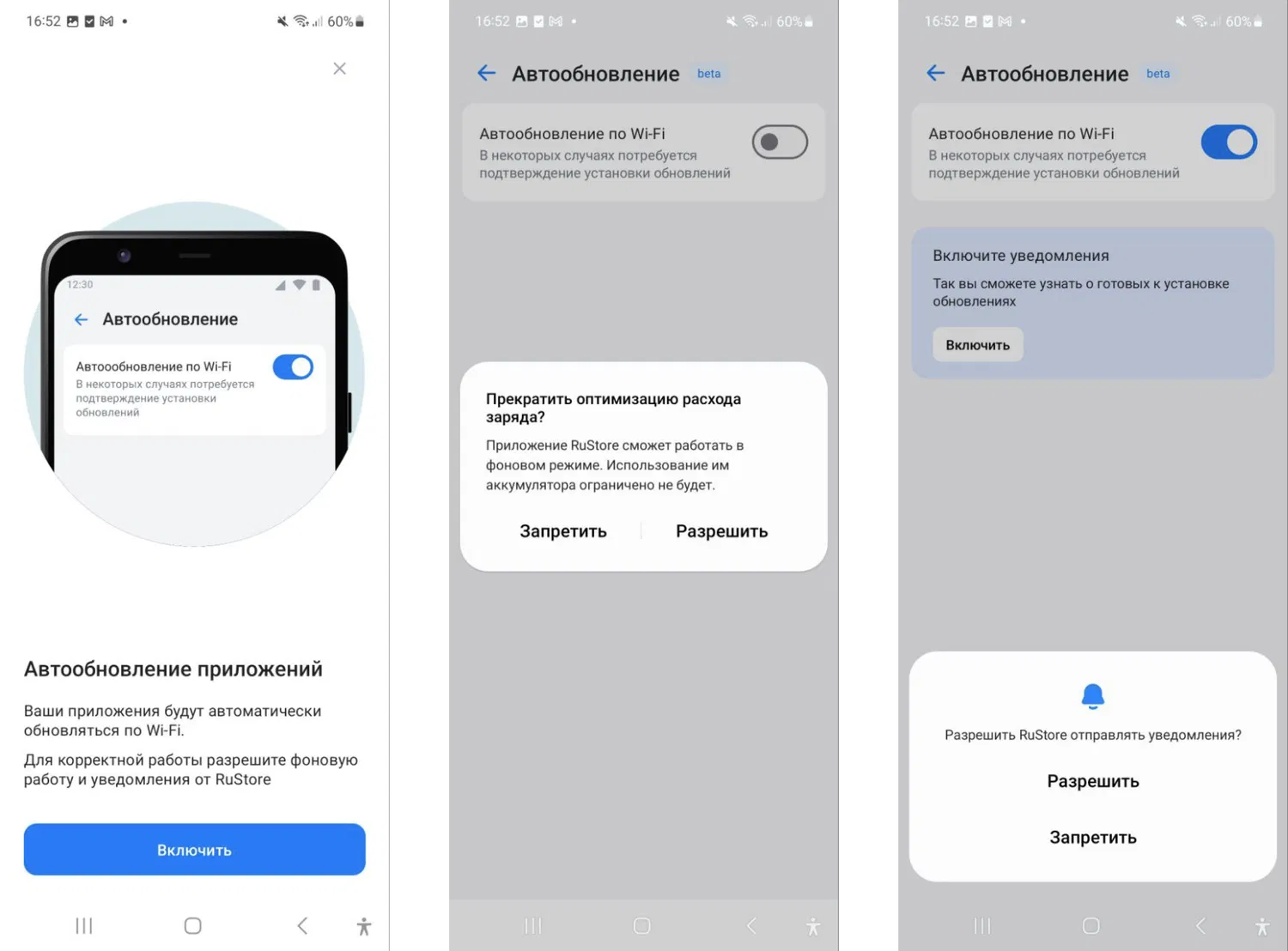Включив пункт «Автообновление» в RuStore, новые версии приложений будут автоматически загружаться при подключении к сети Wi-Fi, но для некоторых устройств может понадобиться подтверждение установки обновлений.