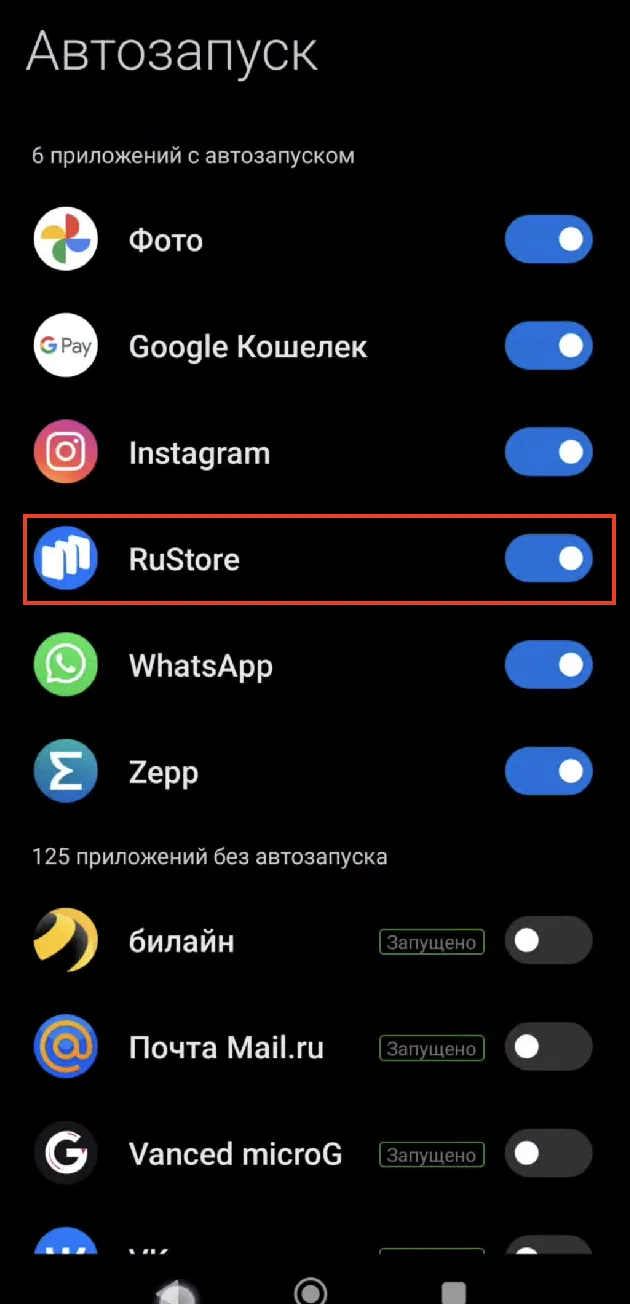 Особенности для устройств Xiaomi: Для корректной работы автообновлений на устройствах Xiaomi, необходимо добавить RuStore в разделе настроек «Автозапуск».