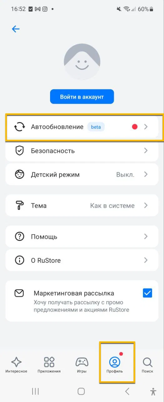 Отключение автообновления: Если пользователь решит отключить автообновление, он может сделать это, перейдя в раздел «Профиль» и выбрав пункт «Автообновление». Затем достаточно передвинуть слайдер справа налево.