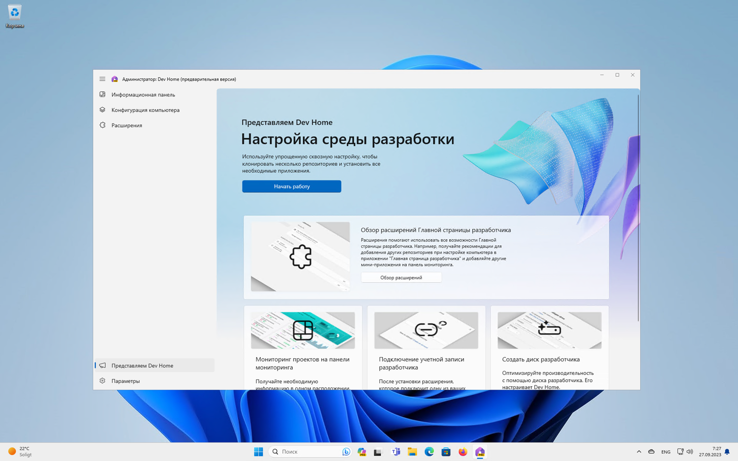 Разработчики получили доступ к Dev Home — более простому способу настройки и использования Windows-машин для целей разработки. В Dev Home используется менеджер пакетов Microsoft Windows Package Manager (winget), служащий для создания конфигурационного файла для установки необходимых приложений, инструментов и пакетов. Кроме того, он позволяет настраивать среды разработки в «облаке» с помощью Microsoft Dev Box и GitHub Codespaces.