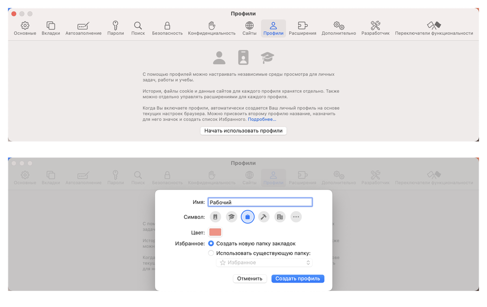 В Safari 17 появилась поддержка профилей. С их помощью можно создавать отдельные пространства для рабочего и личного использования. Каждый профиль имеет свою историю просмотров, файлы cookie, расширения, группы вкладок и избранное. Чтобы начать работу с этой функцией, щелкните по иконке Safari в строке меню и выберите пункт Создать профиль.